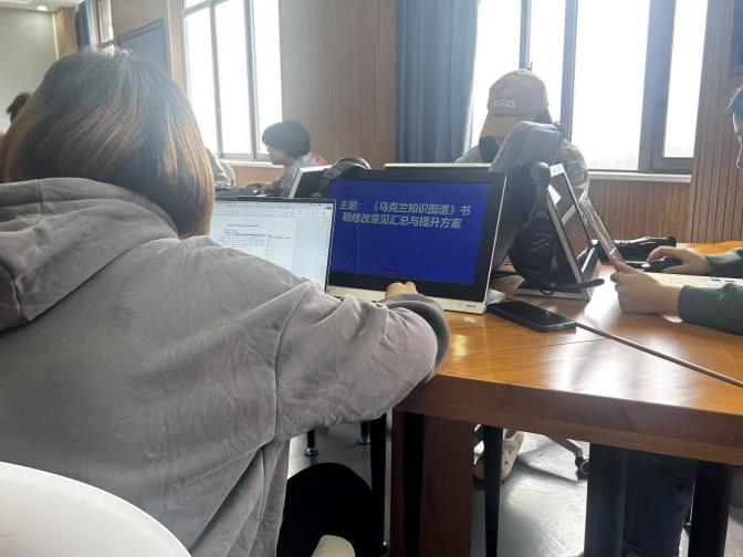 2025年11月3日上午,我院乌克兰语系在培英楼822教室,开展《乌克兰知识图谱》书稿修改意见汇总及提升方案研讨活动。在汪晓宇老师的带领下,同学们全心投入,对各自负责的书稿板块进行了系统性修改与完善。