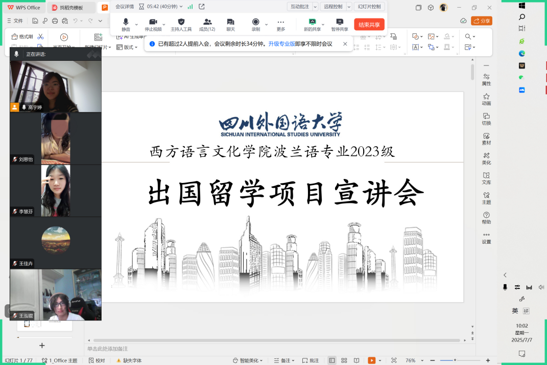 出国留学行前培训会于7月7日上午通过腾讯会议开展,高宇婷老师围绕安全、纪律、学习以及生活等多个关键领域进行了全面且深入的讲解,帮助同学们更好地适应即将到来的留学生活。此外,王珺老师为同学们布置了制作波兰城市生存攻略的任务。
