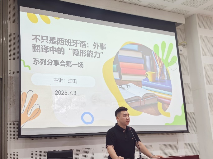 2025年7月3日下午2时30分,四川外国语大学“不只是西班牙语:外事翻译中的‘隐形能力’”系列分享会首场活动在歌乐楼C2-1成功举行。本次分享会由西班牙语系王田老师主讲,主题为“以专业之声,架沟通之桥 —— 从拉丁美洲记者团的接待说起”,吸引了众多对翻译与外事工作感兴趣的学生参与。