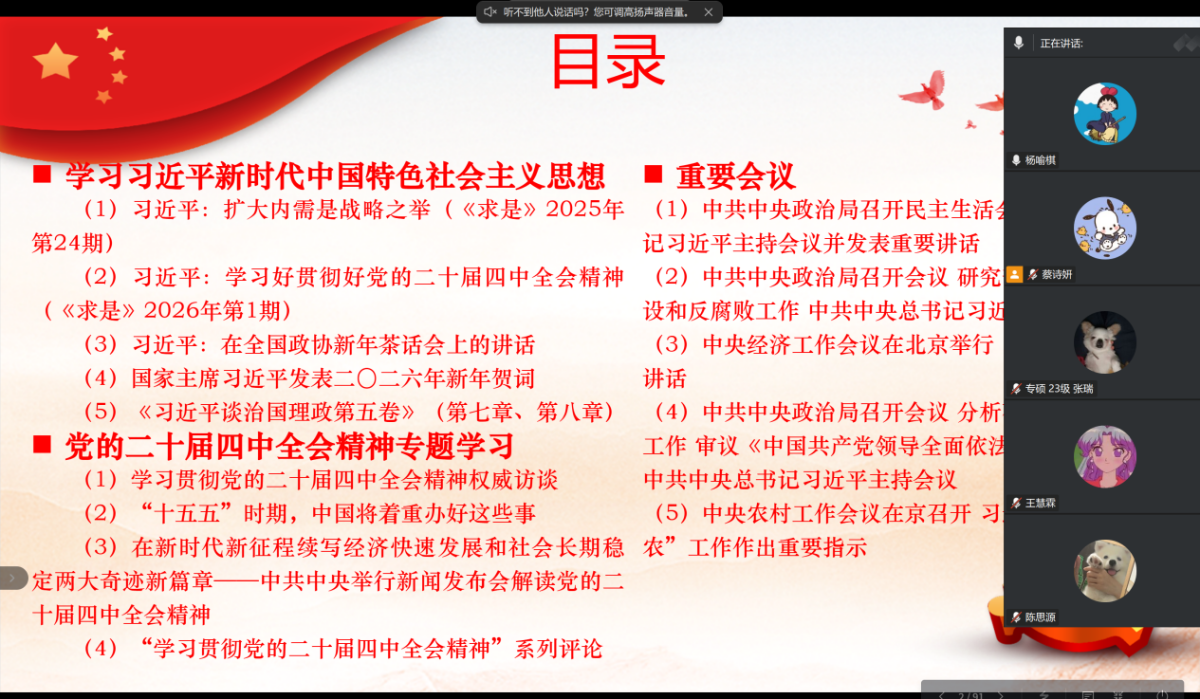 随后,活动进入党的二十届四中全会精神专题学习环节。同志们集中学习了学习贯彻党的二十届四中全会精神权威访谈、“十五五”时期,中国将着重办好这些事等重要内容。大家结合专业学习与时代使命展开热烈讨论,进一步明晰了“十五五”发展蓝图的核心要义,深刻领会到全会精神对于指导实践、推动工作的重大现实意义。