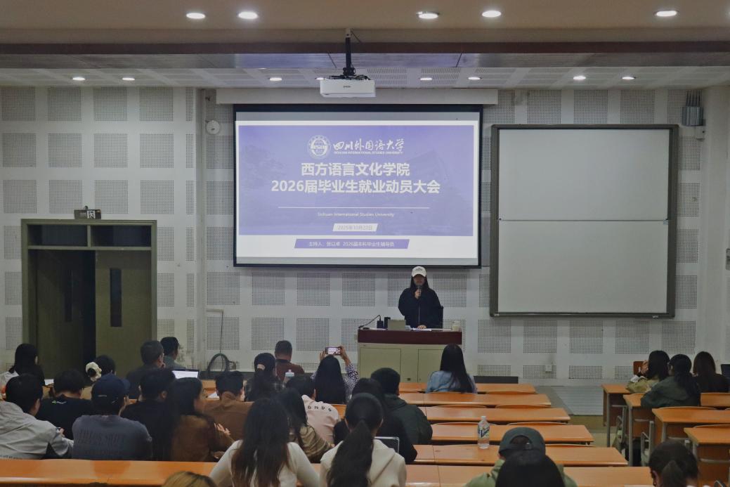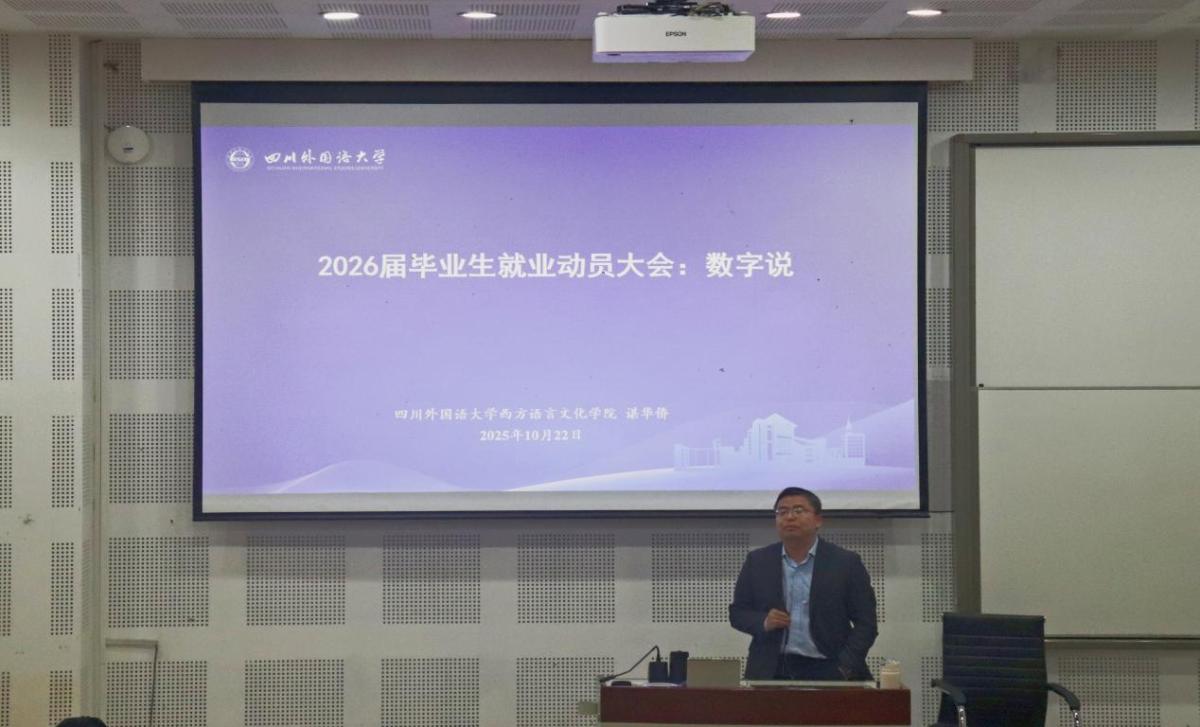 2025年10月22日19时,西方语言文化学院在西区歌乐楼A1-1教室组织召开了2026届毕业生就业动员大会。学院党总支书记苏雪、院长谌华侨、副院长温晓静、葡萄牙语系主任郑佳宝、意大利语系副主任昝婷、捷克语系主任杨杏初、匈牙利语系主任王琳、2026届研究生毕业生辅导员段文佳、2026届本科毕业生辅导员张以卓、2026届全体本科毕业生及研究生毕业生参加了大会。大会由2026届本科毕业生辅导员张以卓主持。