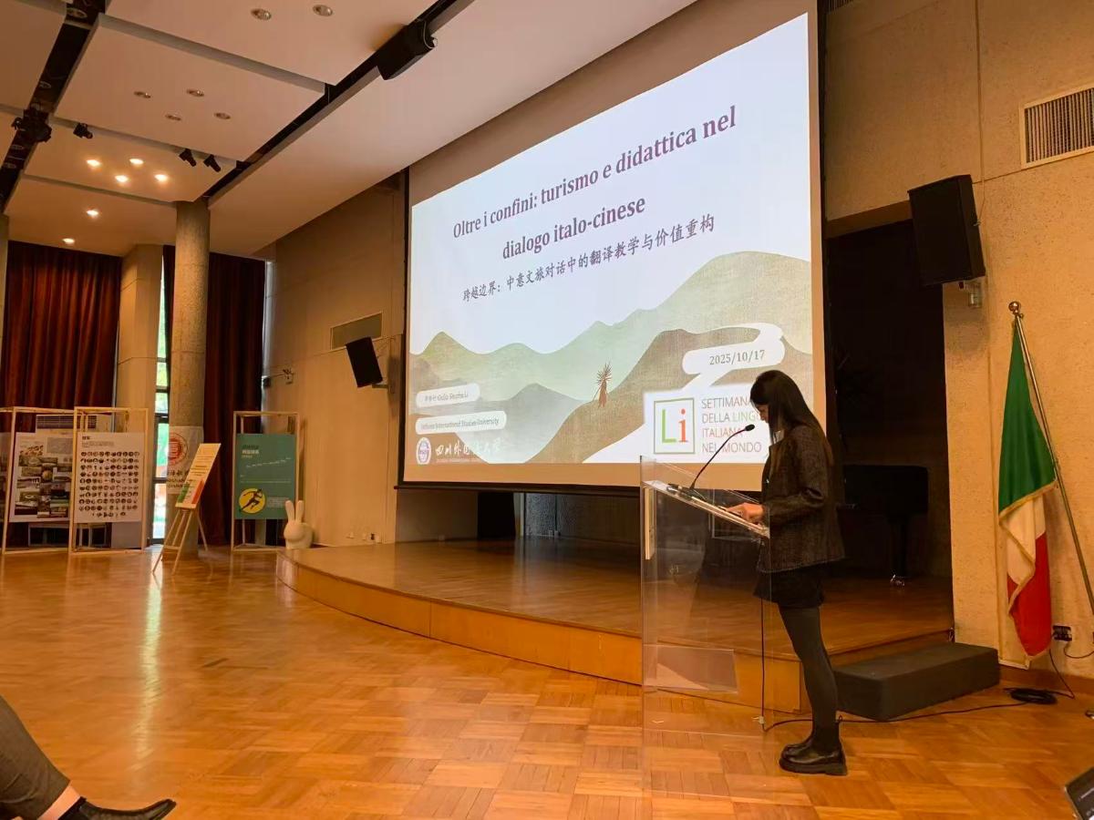 在大会专题发言环节,我院意大利语系李书竹教师以《跨越边界:中意文旅对话中的翻译教学与价值重构》为题,系统阐述了其在中意文化遗产传播领域的前沿研究成果。发言深入解析了当前中意文化交流中存在的“传播短路”现象,精准指出简单直译导致佛教、儒家思想等复杂哲学内涵被简化消解,而语境要素的缺失则使文化遗产陷入“认知不可及”的深层困境。