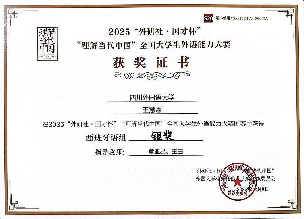 2025年12月6日,由北京外国语大学主办、外语教学与研究出版社承办的“外研社·国才杯”“理解当代中国”全国大学生外语能力大赛(多语种组)全国决赛在北京落幕。西方语言文化学院西班牙语系2024级研究生王慧霖历经校赛、省赛至国赛的层层选拔,一路闯关,最终摘得西班牙语组国赛银奖;2023级本科生韩雨杉亦获铜奖,双双为校争光。