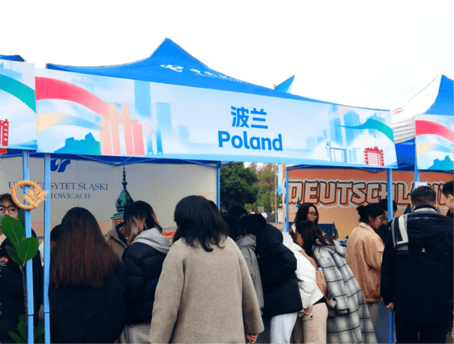 波兰展台不仅带来种类丰富的特色零食与饮品,更精心设置知识问答、寻宝互动、波兰语入门等多元参与环节。师生们在活动互动中,既深化了对波兰历史、语言与文化的认识,也激发了大家对该国文化的探索兴趣。