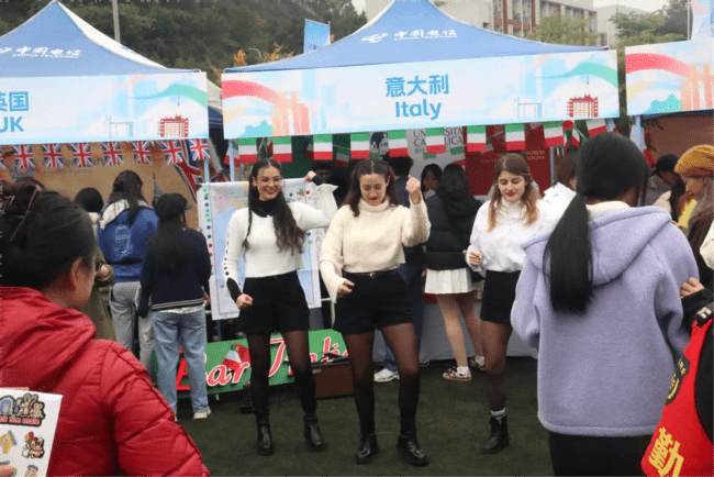 意大利展台展出多款风格各异的精美纪念品与特色美食,吸引众多师生驻足欣赏与品尝。灵动曼妙的意式舞蹈体验,为活动注入浓郁异域文化氛围。师生们在味觉与艺术的双重体验中,全方位感受了意大利文化的独特魅力。